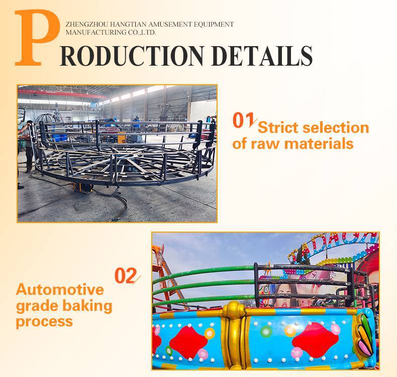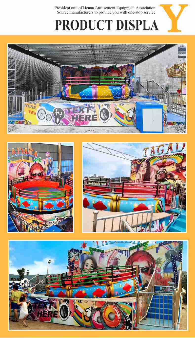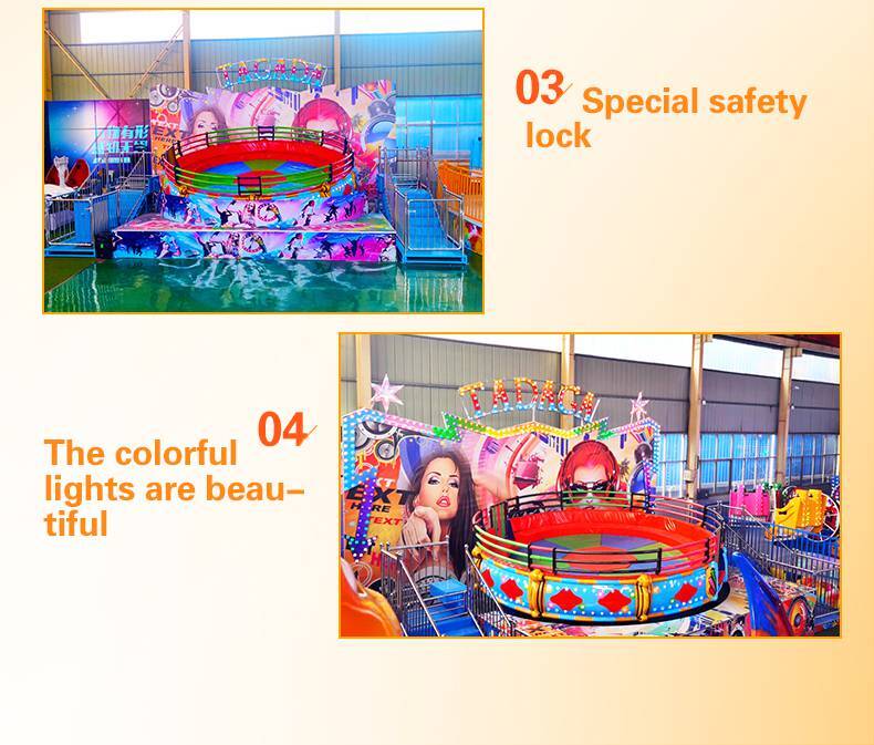 Tagada, also known as Crazy Disco, is a popular gyro ride. The main body is a large disc that swings and rotates, sofa seats around the safa disc. When the device is running, passengers sit in the circle sofa, with rhythmic music, and their bodies wave together with the disc. Under the action of centrifugal force, as if pushed into the celestial body beyond time and space, shaking, spinning, thrilling stimulation, endless aftertaste.