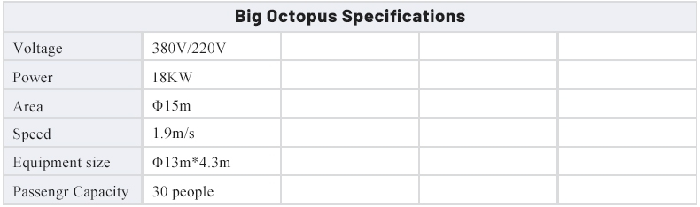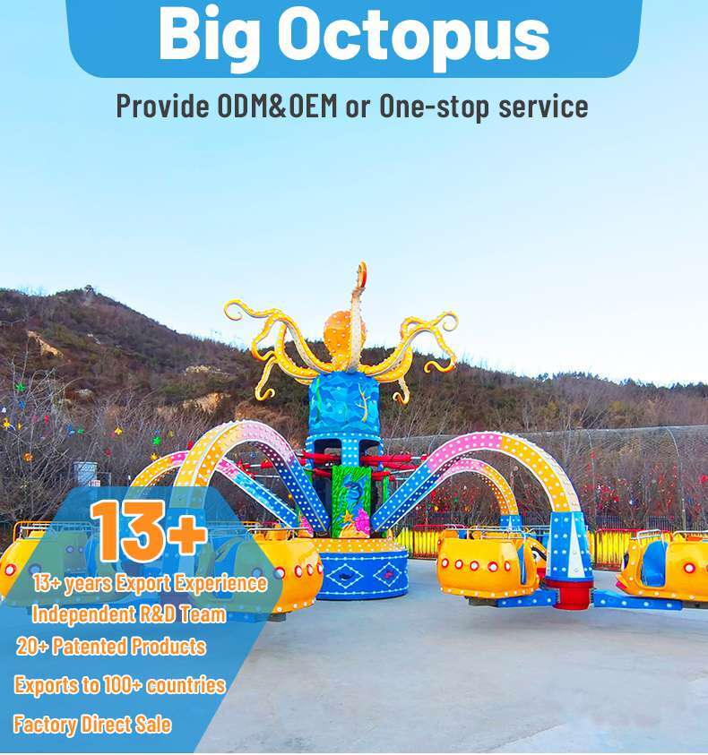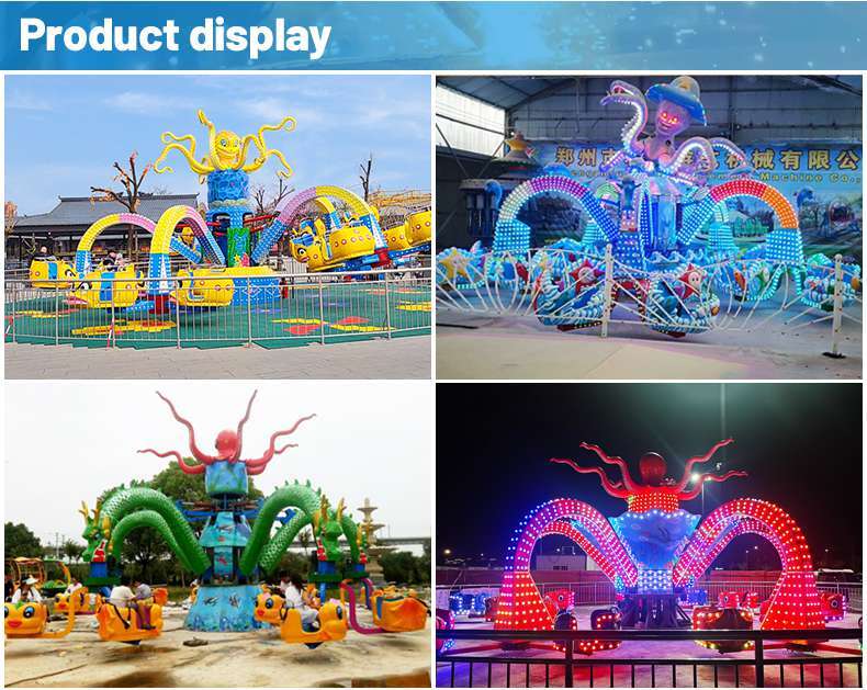 The octopus amusement equipment is named for its resemblance to an octopus, with five arms rising and falling, act like a vivid scene of hunting. Passengers ride on the giant octopus moving from slow to rapid, as if they are in the sea, sometimes on the crest of the wave, sometimes fell into the valley bottom, thrilling, and challenging people's psychological capacity. It’s so interesting and exciting with exquisite appearance, loved by people.