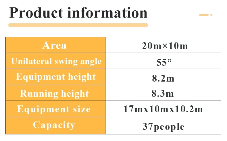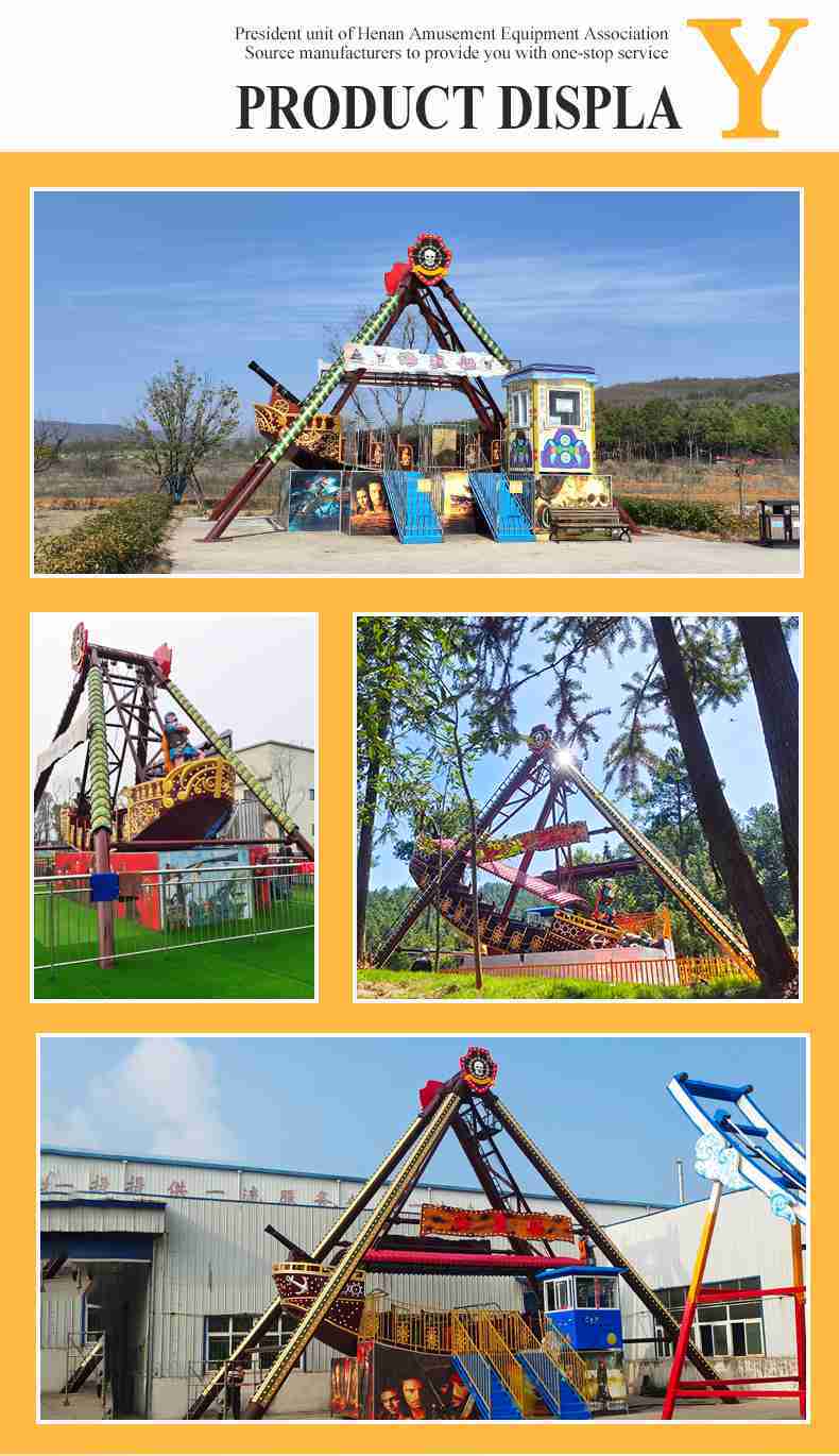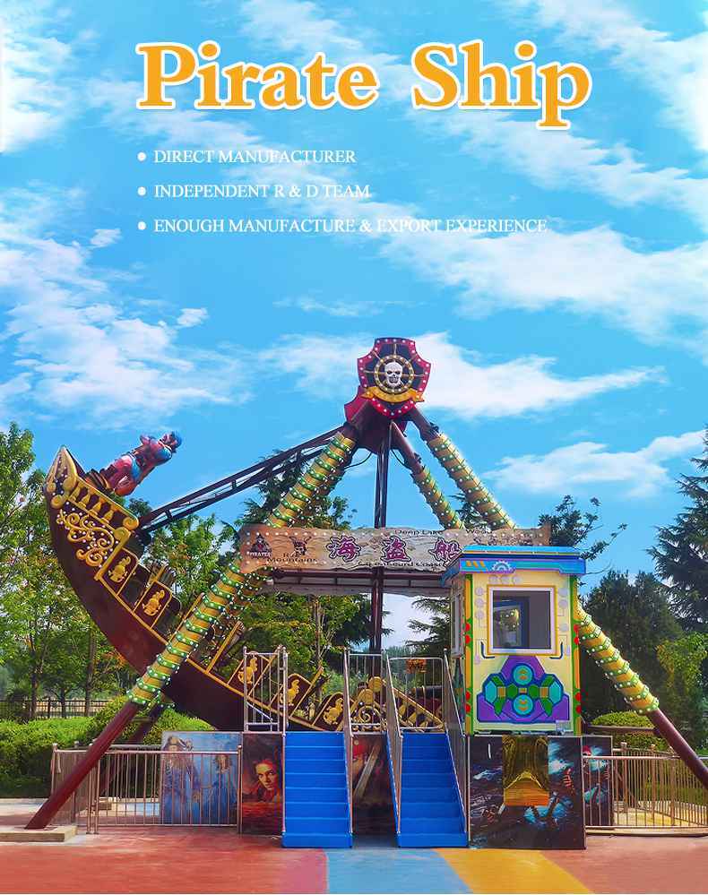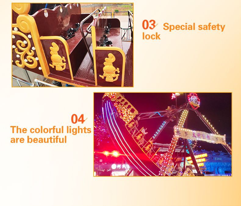 Pirate ship, just like the ancient pirate ship, is a horizontal axis swing repeatedly classic amusement equipment, it starts from slow swinging then slowly swing sharply, sit in the pirate ship, with slow to quick swing repeatedly, like on the waves of the sea, and sometimes on the crest, and sometimes fall off a cliff, adventure and thrilling. Pushing the limits that people can bear.