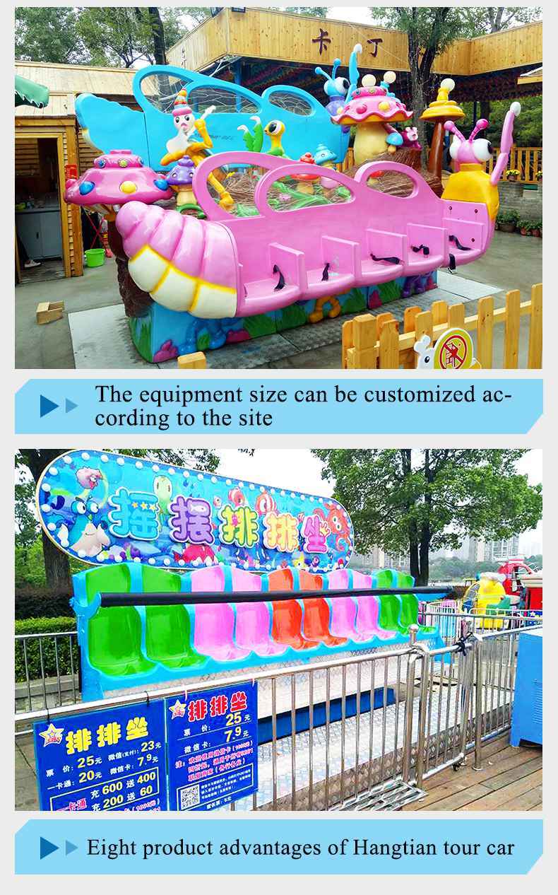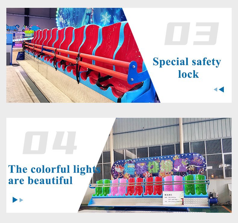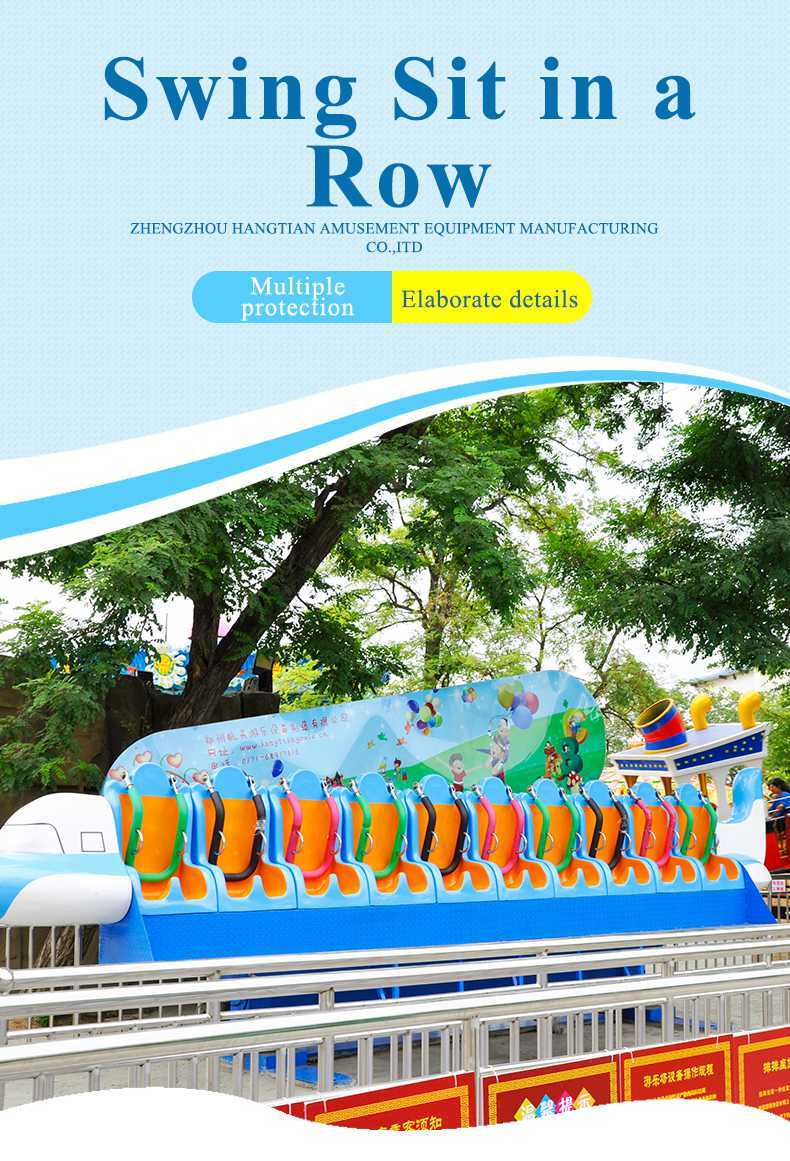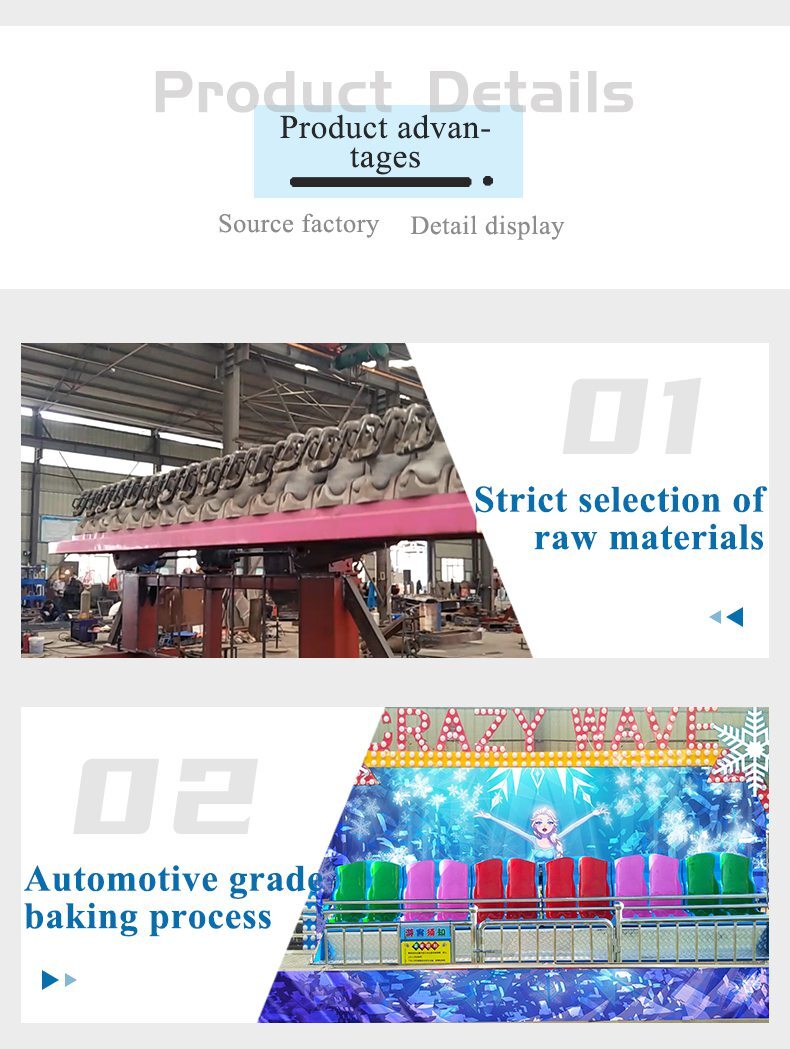 Miami ride also called crazy dance, is a large - scale children's amusement equipment of reciprocating rotation. A long row of seats connected by two swivel arms, the whole movement is carried out in a plane perpendicular to the ground. Passengers sit on the row bench, in the rock music, up and down, left and right rotation with fast speed, feel the alternation of overweight and weightlessness, very exciting, feel the carnival atmosphere in the screaming, body and mind completely released!