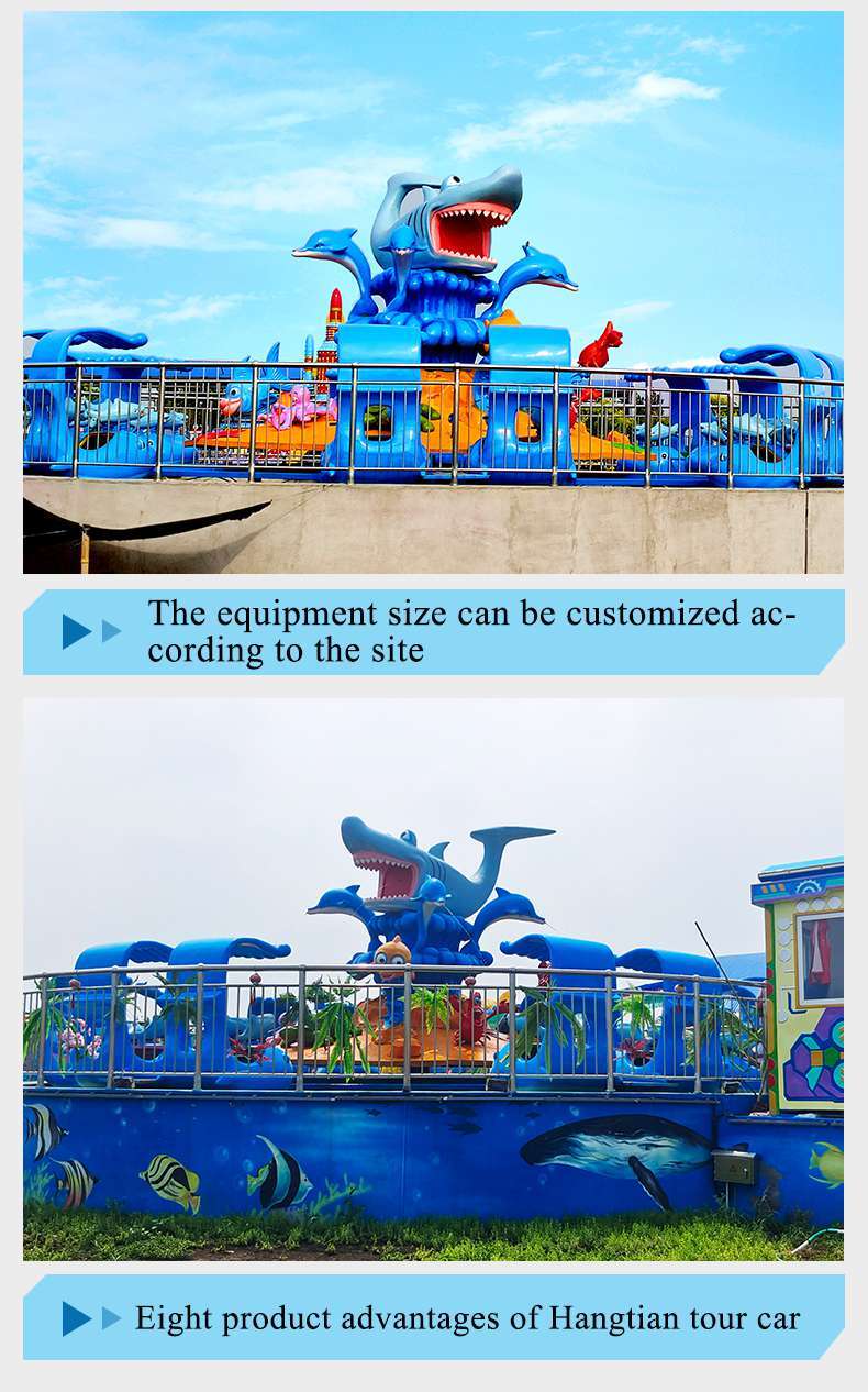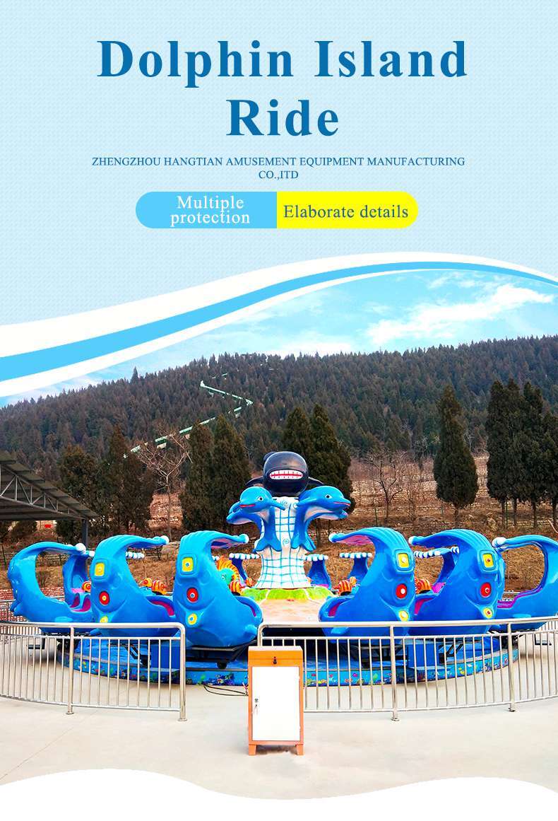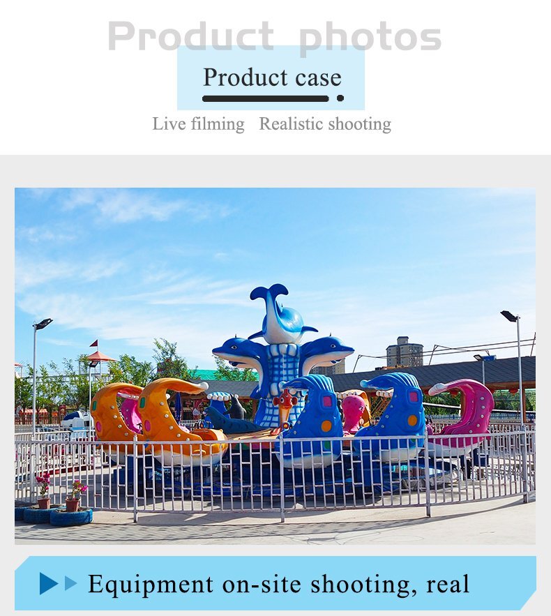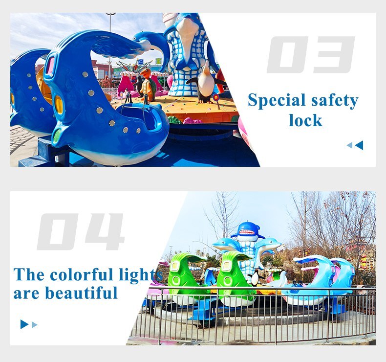 Dolphin ride is a rotating device. While the equipment rotates, passengers can pick up the water gun on the cabin to enhance the interactive fun. When the shark island operation, passengers can revolve around the theme and picked up the gun to attack middle subject, after hitting the target, the animal in the center will spray water, raise his hand or other actions, lovely, interesting, also the shark will spray water to the passengers too. It makes the machine more interesting and interactive.