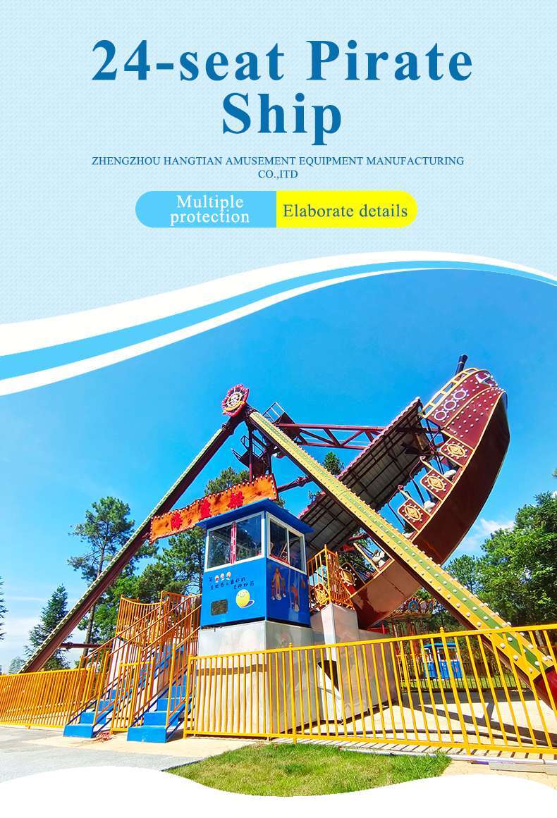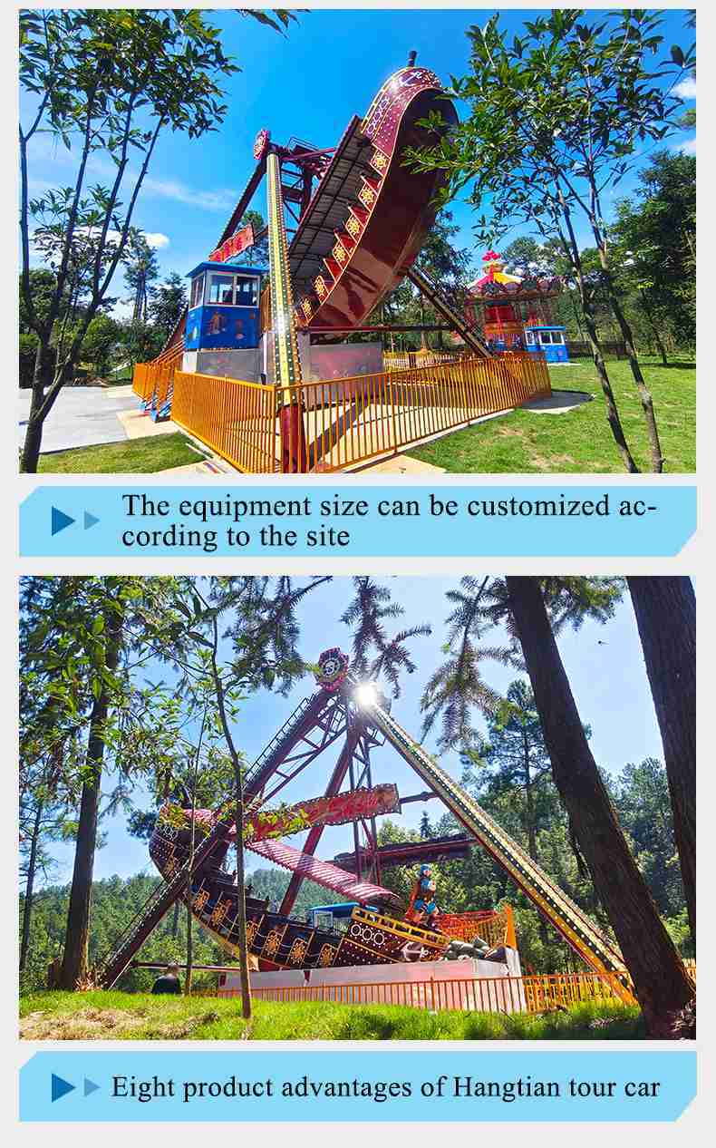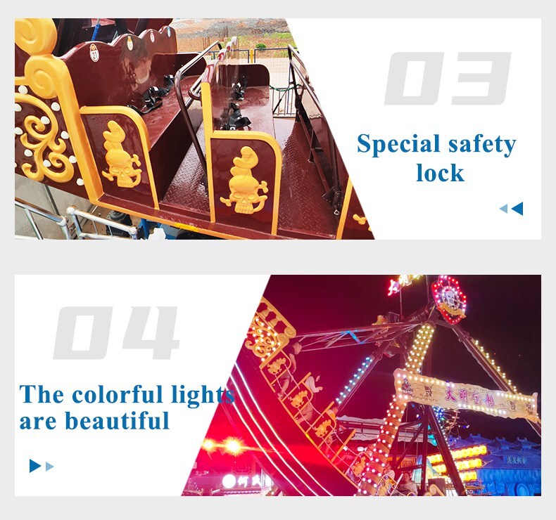 Pirate ship, just like the ancient pirate ship, is a horizontal axis swing repeatedly classic amusement equipment, it starts from slow swinging then slowly swing sharply, sit in the pirate ship, with slow to quick swing repeatedly, like on the waves of the sea, and sometimes on the crest, and sometimes fall off a cliff, adventure and thrilling. Pushing the limits that people can bear.