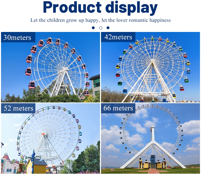 Ferris wheel is a large sightseeing vehicle. This product contains 54 cabins. Passengers sit in the cabins and slowly turn up, so that they can overlook the surrounding scenery from a high space. Ferris wheel also is an indispensable amusement park facilities, which can bring city bright and beautiful.